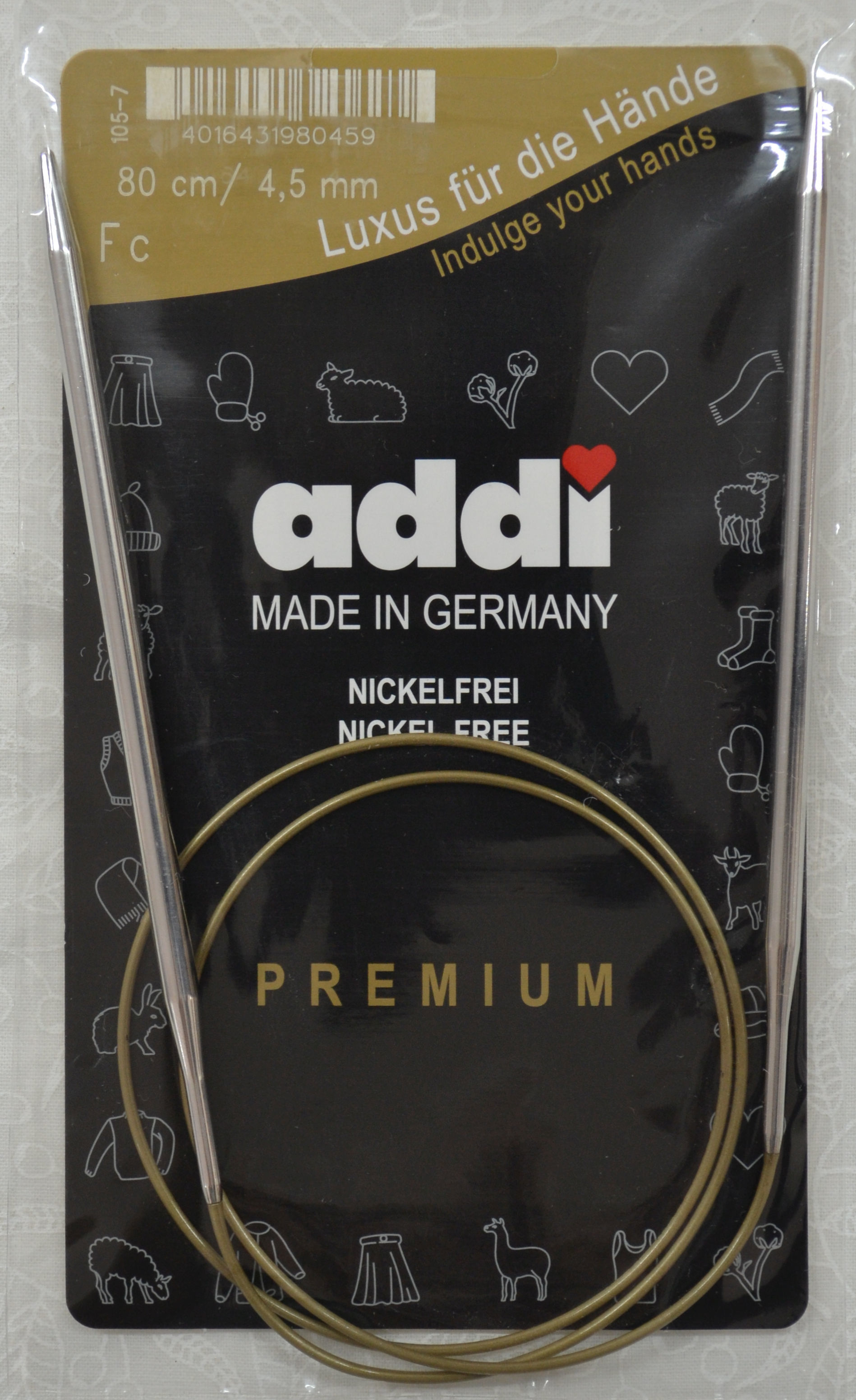 Addi Circular Knitting Needle 70cm x 4.50mm, Smooth White Brass Tips, Gold Cords