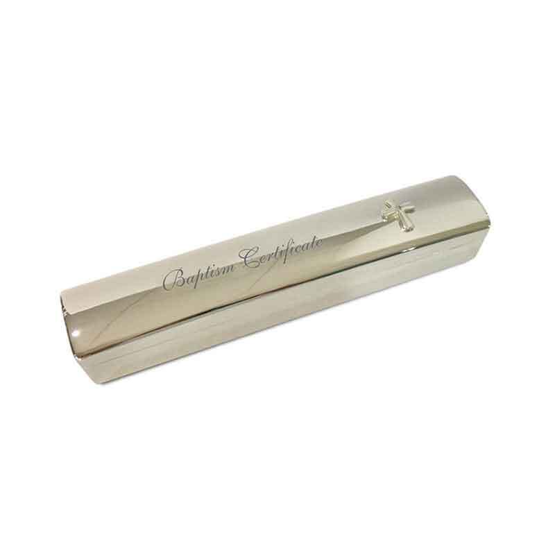 A Baptism certificate box in a highly polished silver tone metal. This is a quality gift product.