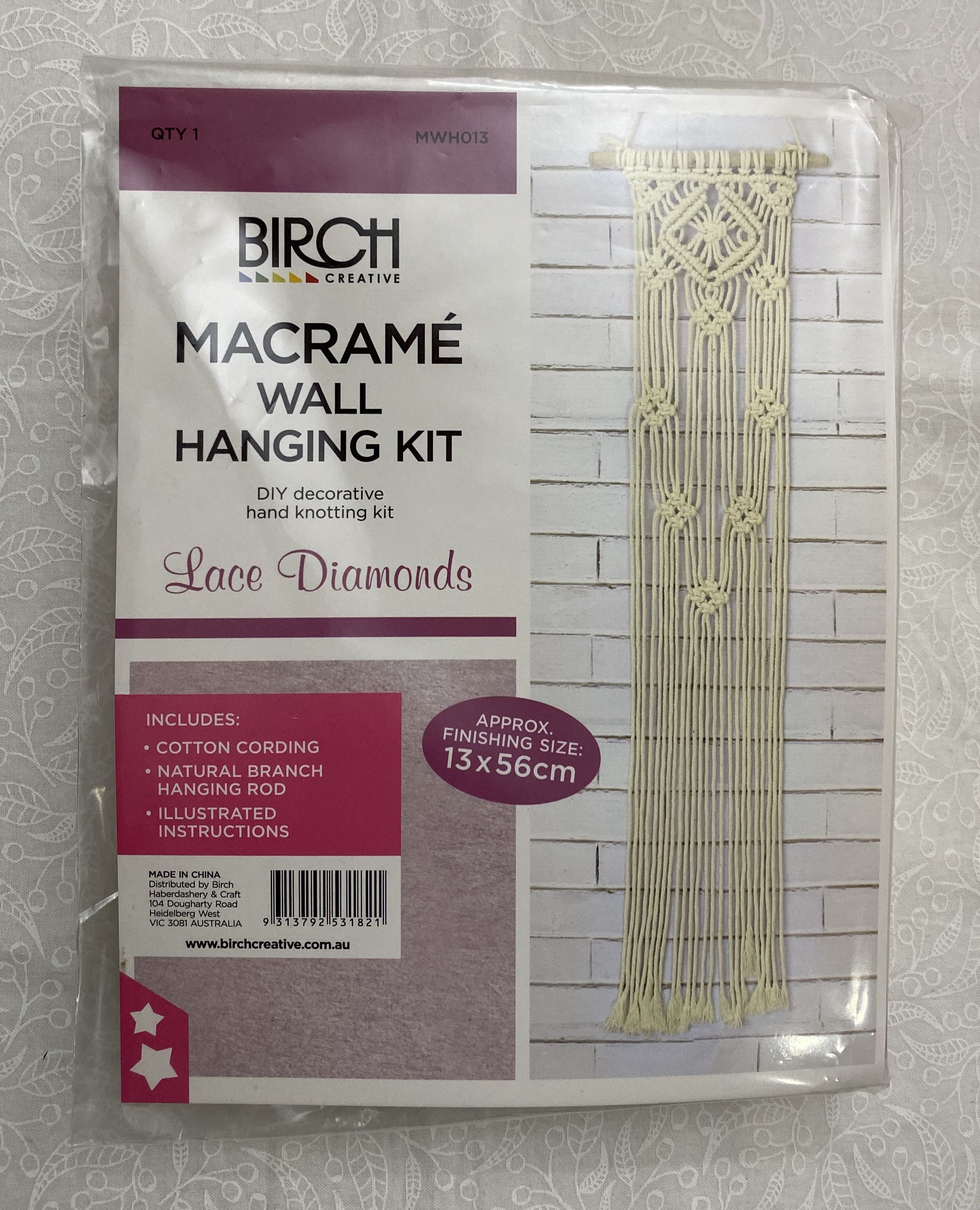 Birch Macrame Wall Hanging Kit, LACE DIAMONDS, MWH013, Approx. 13cm x 56cm