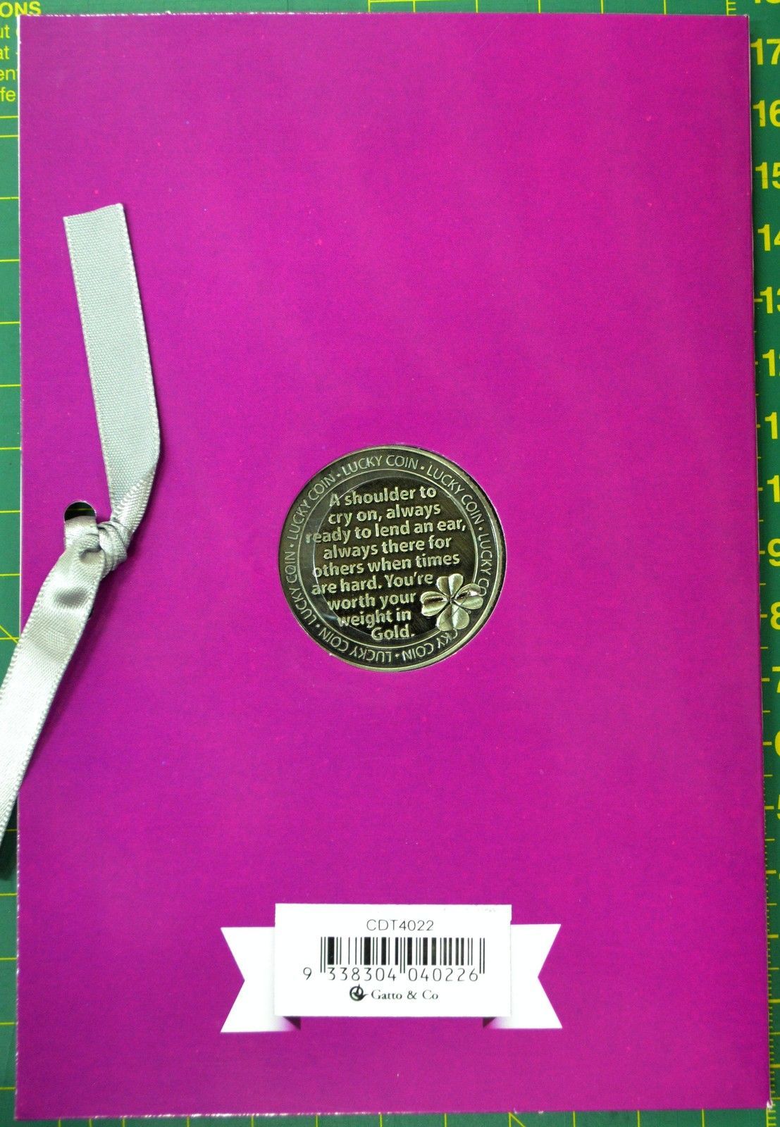 A high quality, beautifully designed, metal LUCKY COIN contained in a Gift Card with ribbon closure, 115mm x170mm; the metal lucky coin is 35mm in diameter and contains the following message on the reverse side.