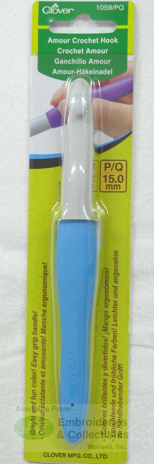 This 15.0mm Clover Amour Crochet Hook has an easy grip handle made from Elastomer Rubber.
