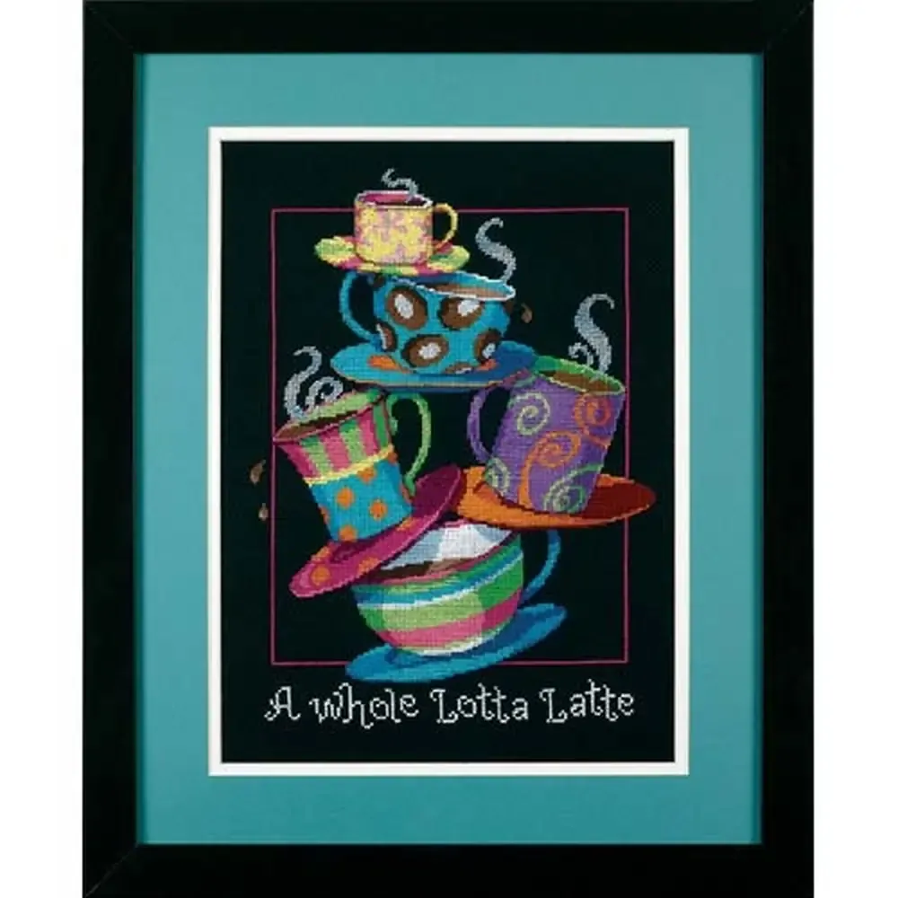 With its contemporary flair, A Whole Lotta Latte in counted cross stitch will brighten your kitchen decor. Makes a great housewarming gift! Counted cross stitch contains presorted cotton thread, 14 count black cotton Aida, needle, and easy instructions. Finished Size: 28cm x 36cm (11" x 14"). Designed by Barb Tourtillotte. © Barb Tourtillotte.
