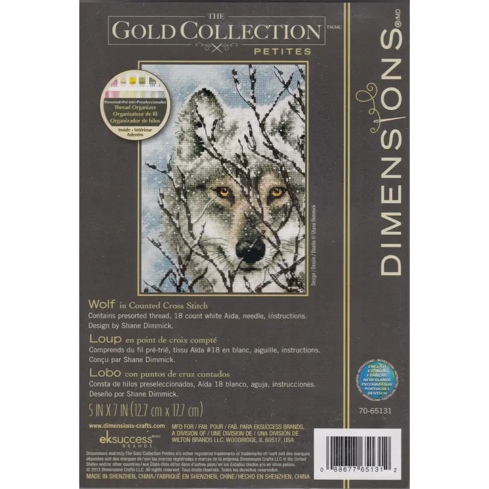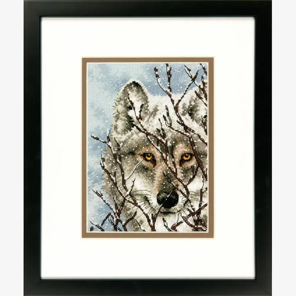 A magnificent wolf keeps a watchful eye over his surroundings in this wintry counted cross stitch scene by Dimensions. Part of the Gold Collection. Size: 5" x 7". Designed by Shane Dimmick. © Shane Dimmick. Counted cross stitch kit contains: • Presorted cotton thread• 18 count white Aida• Needle• Easy instructions