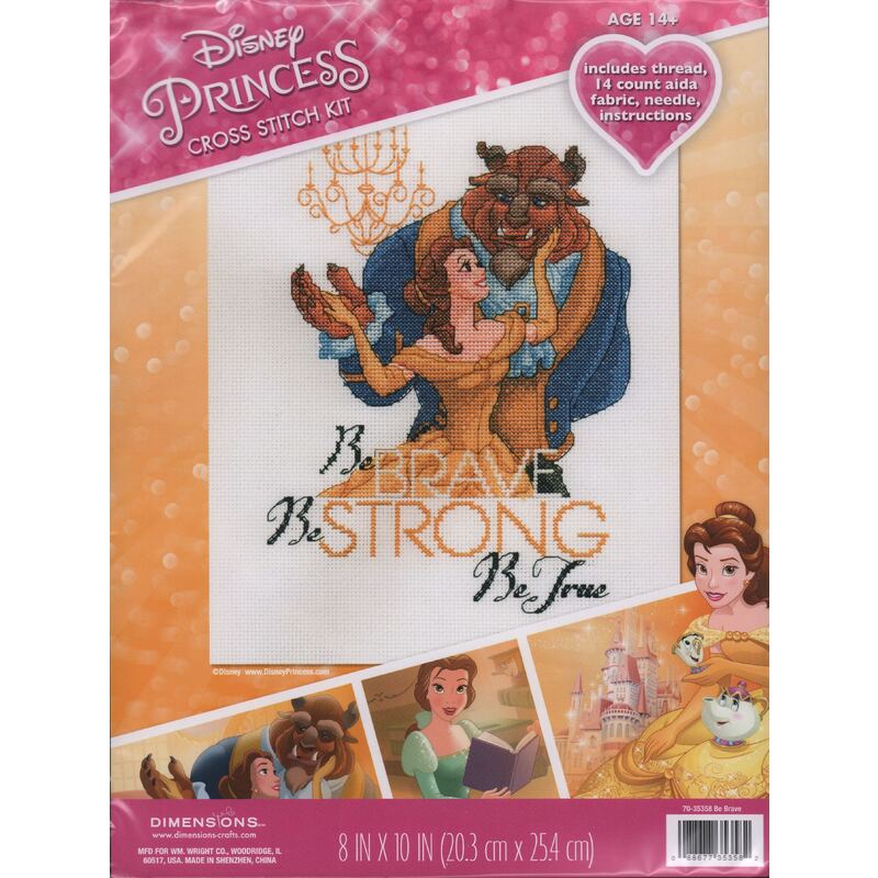 The inspirational Be Brave in counted cross stitch by Dimensions showcases enchanting Beauty and the Beast. Finished size: 8" x 10". © Disney www.DisneyPrincess.com. This counted cross stitch kit contains presorted thread, 14 count white Aida, needle, and easy instructions.