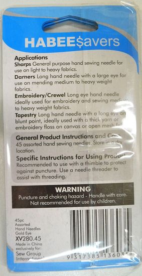 Packet contains an assortmen of 45 needles including, sharps, darners, embroidery / crewel and tapestry needles