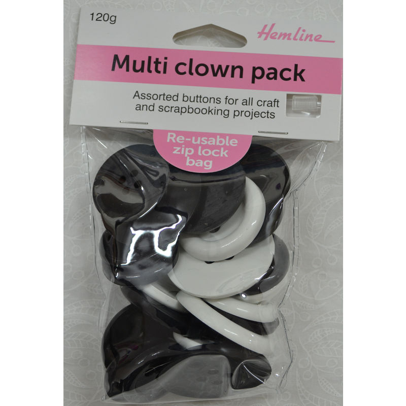 Hemline Buttons, Multi Clown Pack Large Buttons, Assorted Black and White. 120 gram net