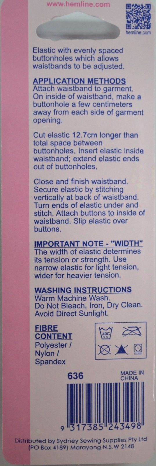 Hemline Buttonhole Elastic 15mm, 0.9mtrs, Even Spaced Buttonholes Which Allows For Waistband Adjustment