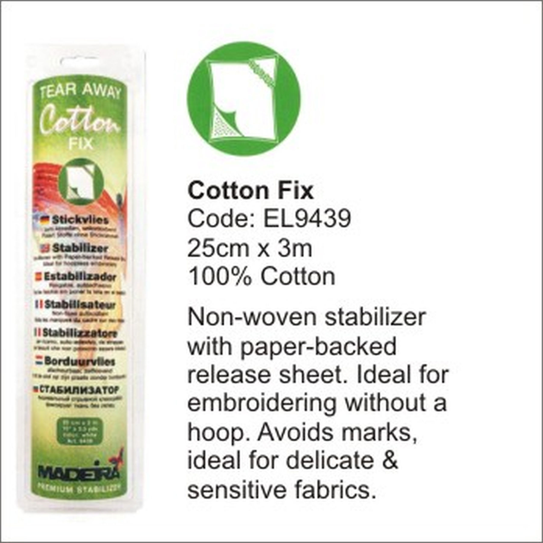 Cotton Fix is an adhesive stabilizer with a paper back release sheet. Simply hoop Cotton Fix stabilizer paper side up, score and remove release paper to expose adhesive. Finger press fabric to the Cotton Fix and put the hoop on your machine for embroidery.