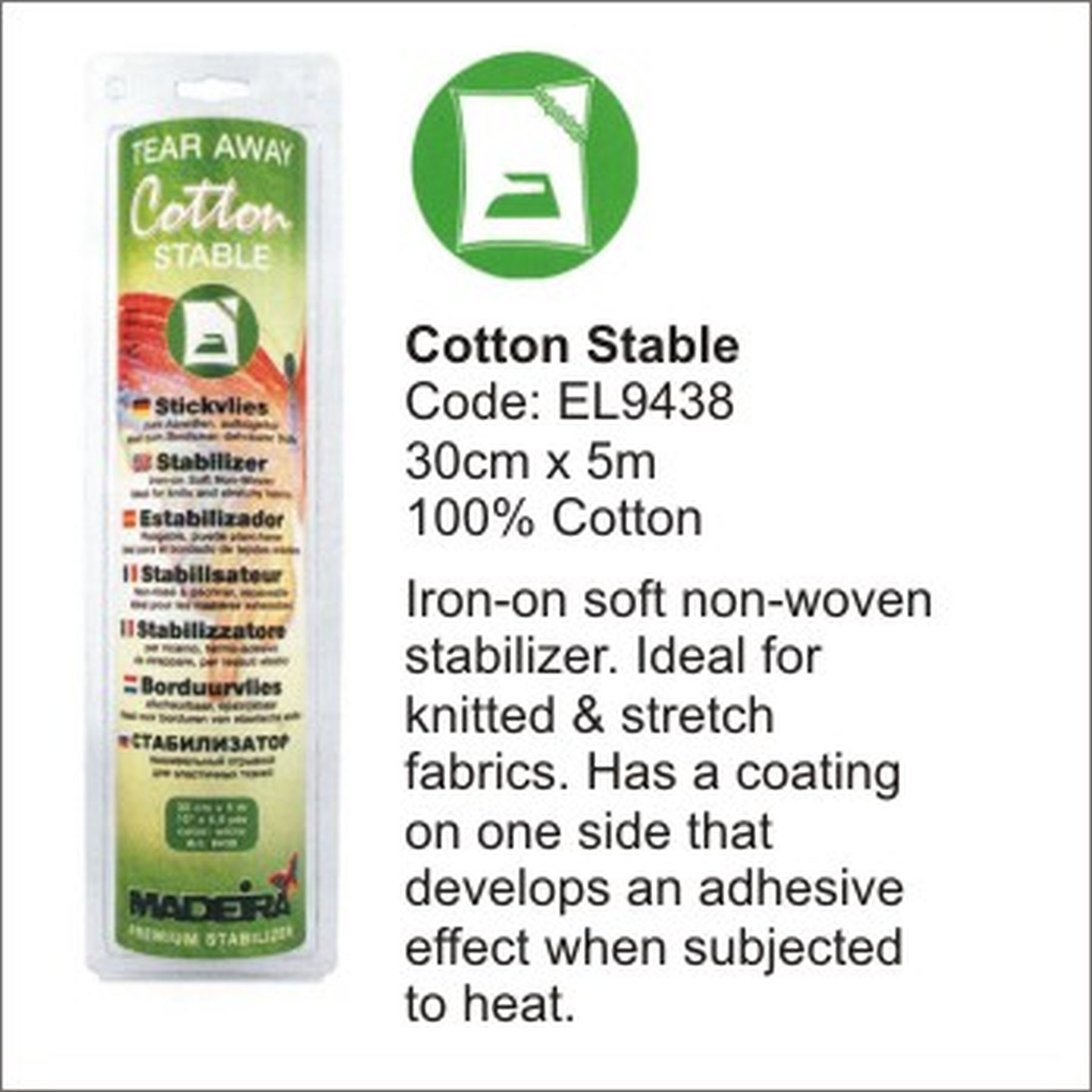 Ideal for knits and stretch fabrics. Cotton Stable has a coating on one side that develops an adhesive effect when subjected to heat. Eliminates shifting, sliding, puckering, and stretching of material. The iron-on coating produces only a weak adhesive effect allowing the removal of Cotton Stable without residue.