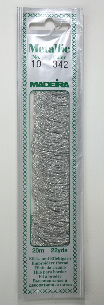 Madeira Metallic Perle No. 10 thread comes in 20 m (22 yds) StickTwist packs and is 40 % Polyamid, 60 % metallised Polyester.