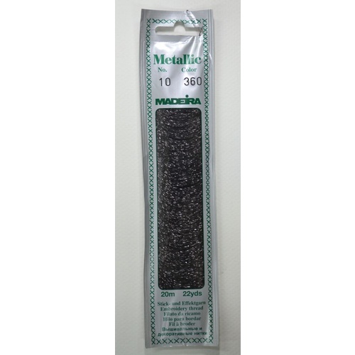 Madeira Metallic Perle No. 10 thread comes in 20 m (22 yds) StickTwist packs and is 40 % Polyamid, 60 % metallised Polyester.