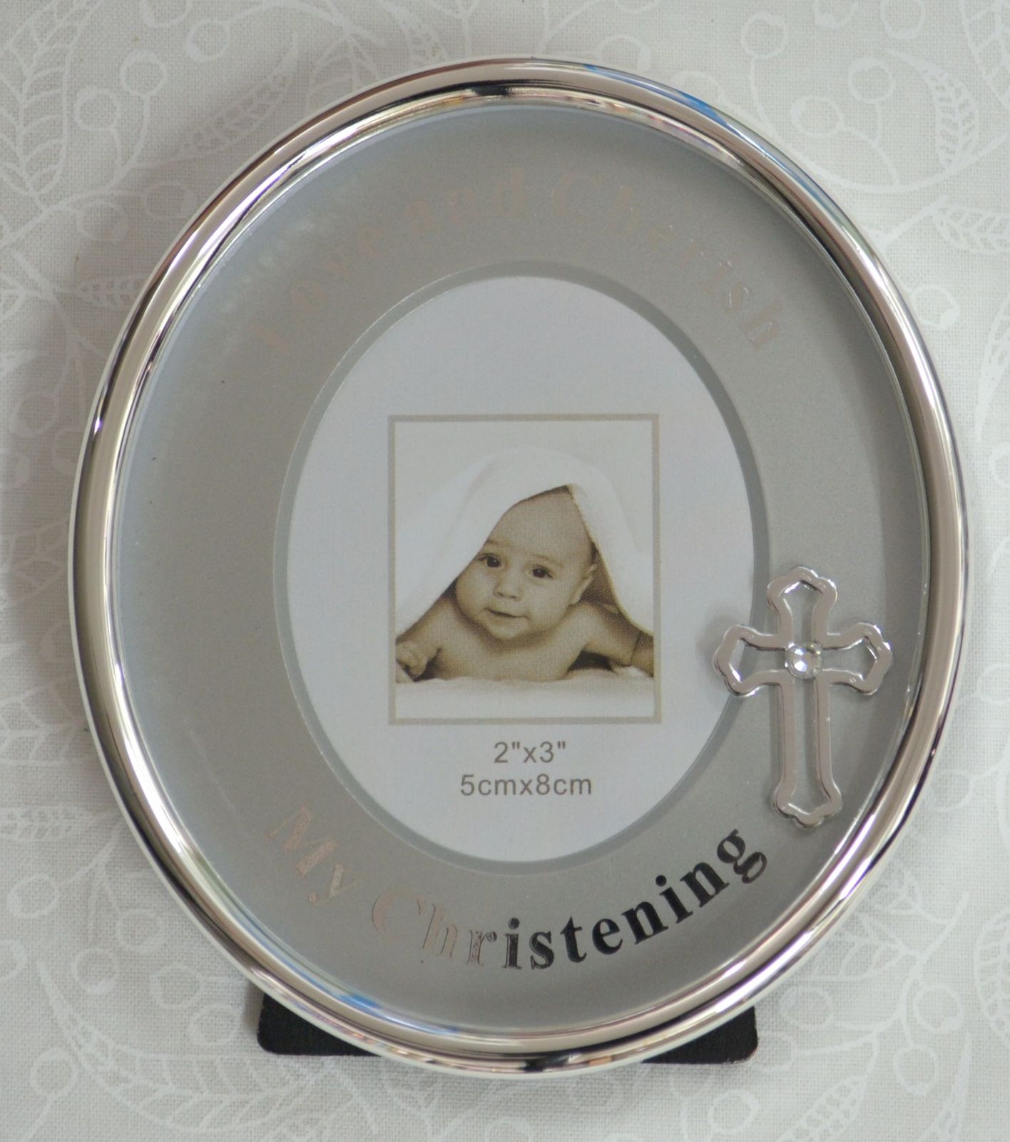 Photo surrond has a cross as shown and "Love and Cherish" written in silver at the top and "My Christening" along bottom. (Wording did not photograph well due to reflections but stands out extremely well in real life)