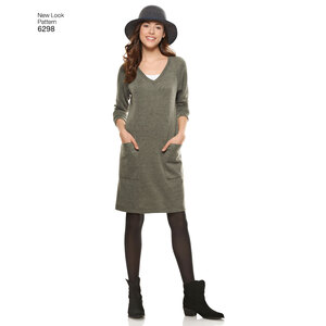 Misses' easy Just4Knits dress is what you are looking for this season! Knit dress with options that include V or scoop neck, long or three-quarter sleeve, pockets and cut lines for length variation. New Look sewing pattern.