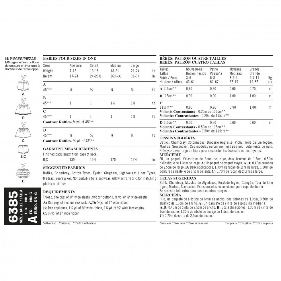 Romper for babies' can have trim and bow in one fabric, or contrast ruffles and sweetheart neckline. Dress can be made with butterfly appliques and trim, or with sweetheart neckline, ruffle and bows. Panties included. New Look sewing pattern.