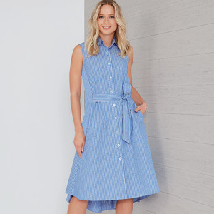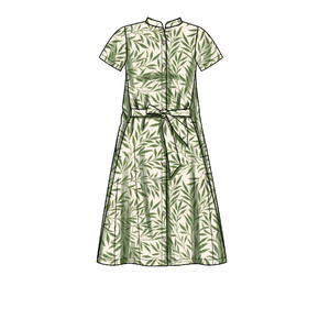 Misses' front-fastening dresses in two lengths, with front waist tie. View A is knee-length with short sleeves and small stand collar. View B is sleeveless with small collar and dipped back hem. Designed for crisp wovens.