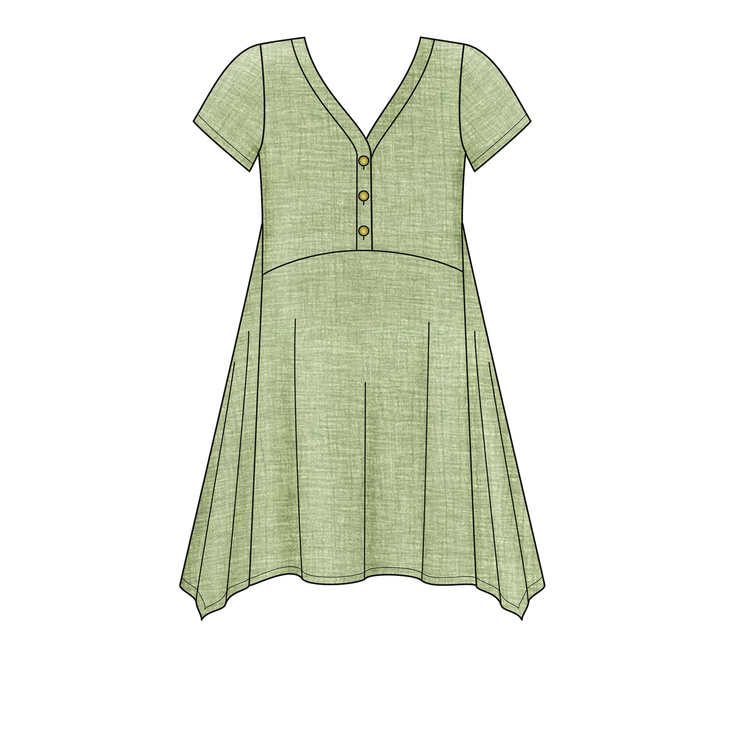 Misses' Tops in two-lengths with asymmetric hems are pull-on with high-waist seaming, v-neckline with front button fastening. Short sleeves or sleeveless. Designed for soft wovens.
