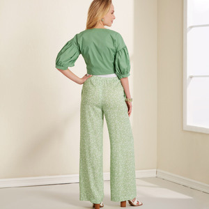 Misses' softly tied jacket with puffed sleeves gathered into bands & pull-on, wide leg pants