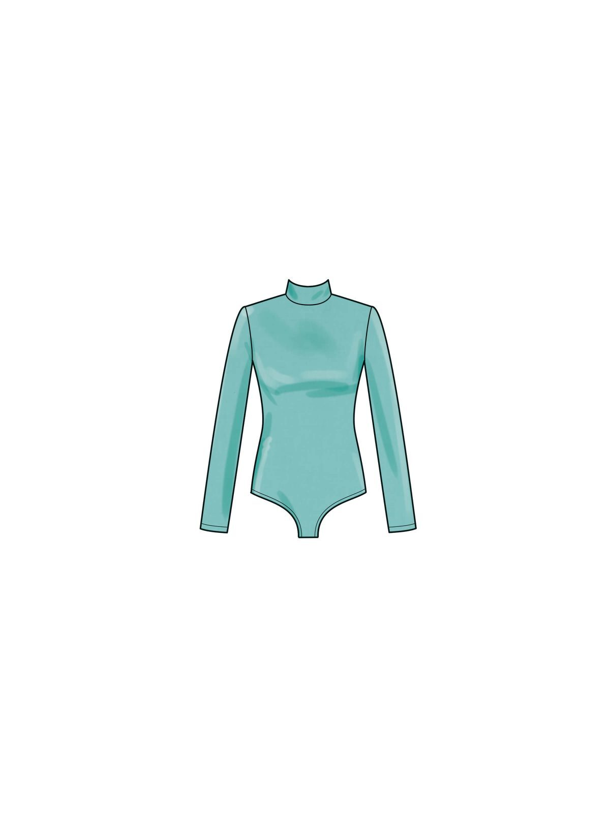 Long sleeve bodysuit, deep V-neck wrap front or mock neck. Sized for stretch knits only. Sew Rating: Average.
