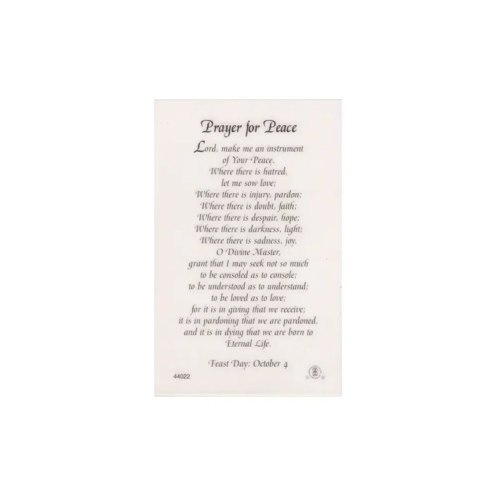 Printed card is laminated, has the image shown on one side, and the "Prayer For Peace" printed on the other side.