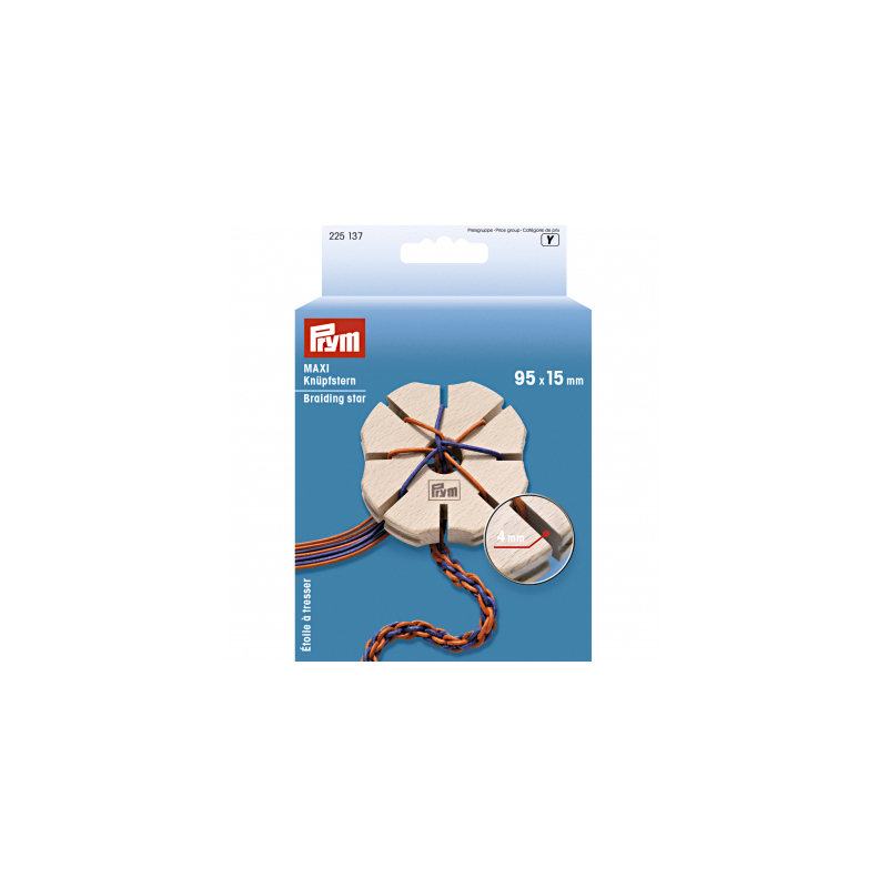 Prym's wooden braiding stars ensure a quick sense of achievement when knitting friendship bracelets, personalised bag handles, bookmarks, and straps for glasses. Use it to knit up to seven threads into a strap in a few easy steps. Since using it is as easy as pie, even young knitting fans will have great fun in handicraft and achieve creative results in no time. For thin threads, the braiding star with a 1.5 mm groove width is suitable, while the MAXI braiding star with a 4 mm groove width can be perfectly used for thicker wool threads and leather bands. Packaging includes a rubber for temporarily securing the thread and instruction manuals.