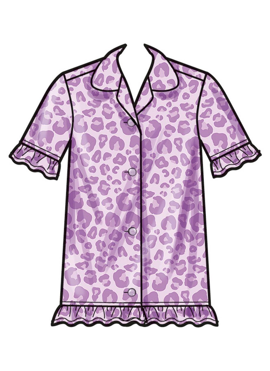 Lounge tops, gown, shorts and pants hems are trimmed with self-ruffles. Button closure tops and gown have shoulder seams that come to the front. Shorts and pants have elastic waist. Purchase sizes separately for Children’s and Girls.
