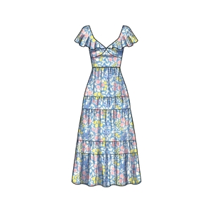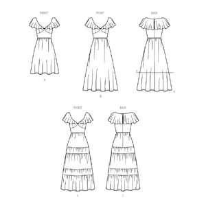 Dresses with flounced collars forming flutter sleeves. V-shape neckline, bust darts and side seam pockets. Bodice and Yoke are lined. Skirts have soft gathers at waist. View C: gathered tier skirt. Length variations. Designed for woven fabrics. Sew Rating: Average.
