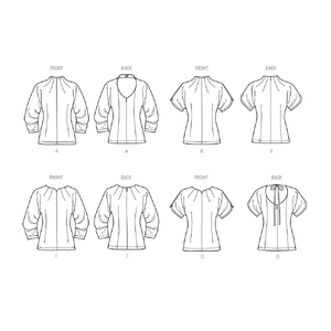 Fitted tops feature darted neckline with four variations. Long or short grown-on with ruched detail. Tops A and D have an open upper back. Invisible zip closure. Designed for woven or stable ponte knit fabrics. Sew Rating: Easy.