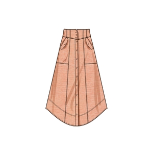 Button-front panelled skirts feature back yokes and have length and hem style variations. Skirts features front slant pockets or flap pockets with button closure. Designed for woven fabrics. Sew Rating: Average.