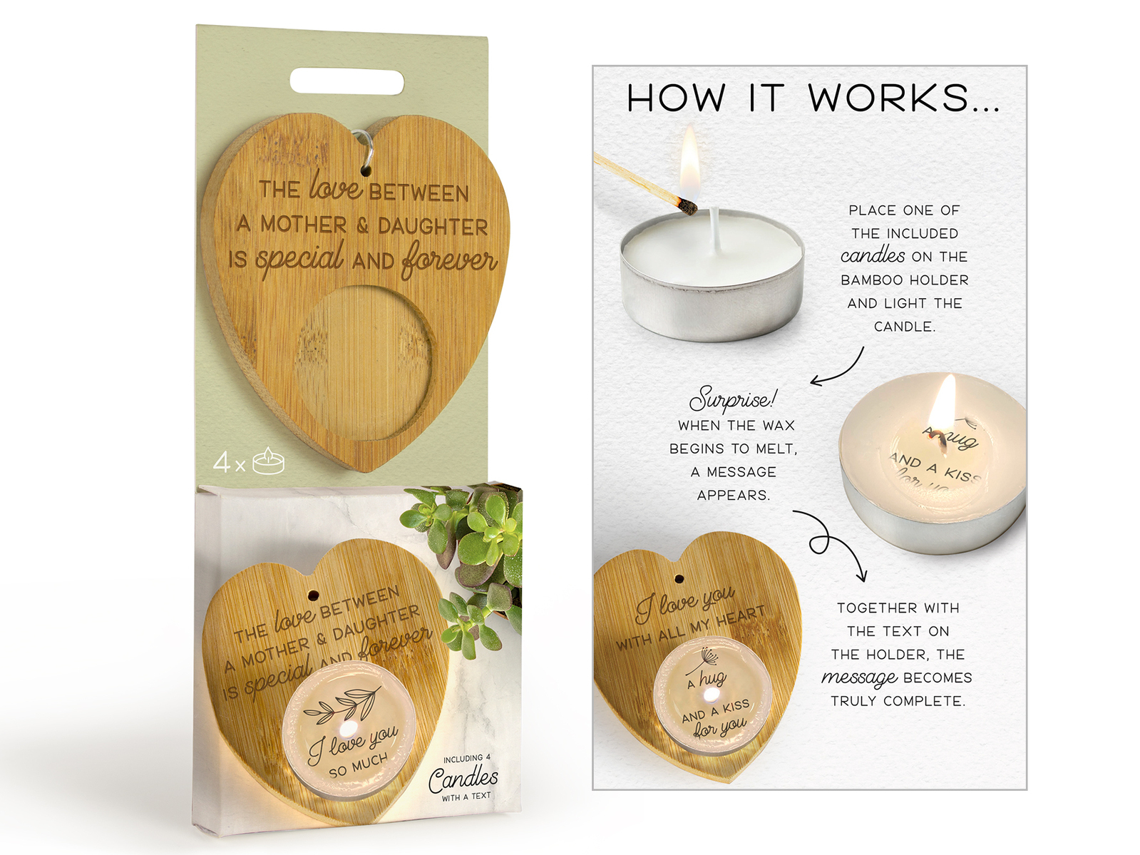 A beautiful gift for someone special, a bamboo tealight holder and tealight. Light the tealight candle and see the surprise at the end. Once the tealight has burned you'll see a beautiful inspirational message appear.