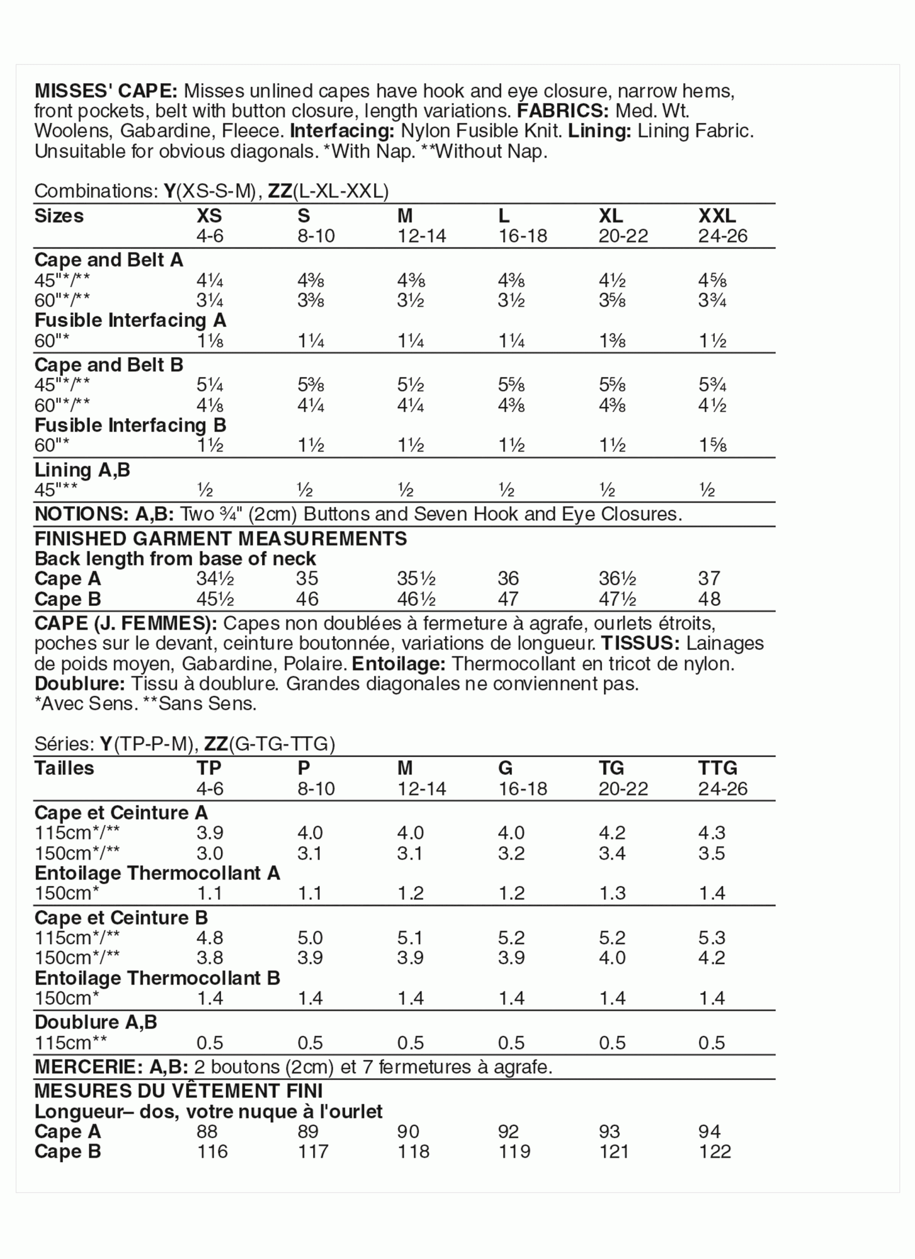 Misses' unlined capes have hook & eye closure, narrow hems, front pockets, belt with button closure, length variations.